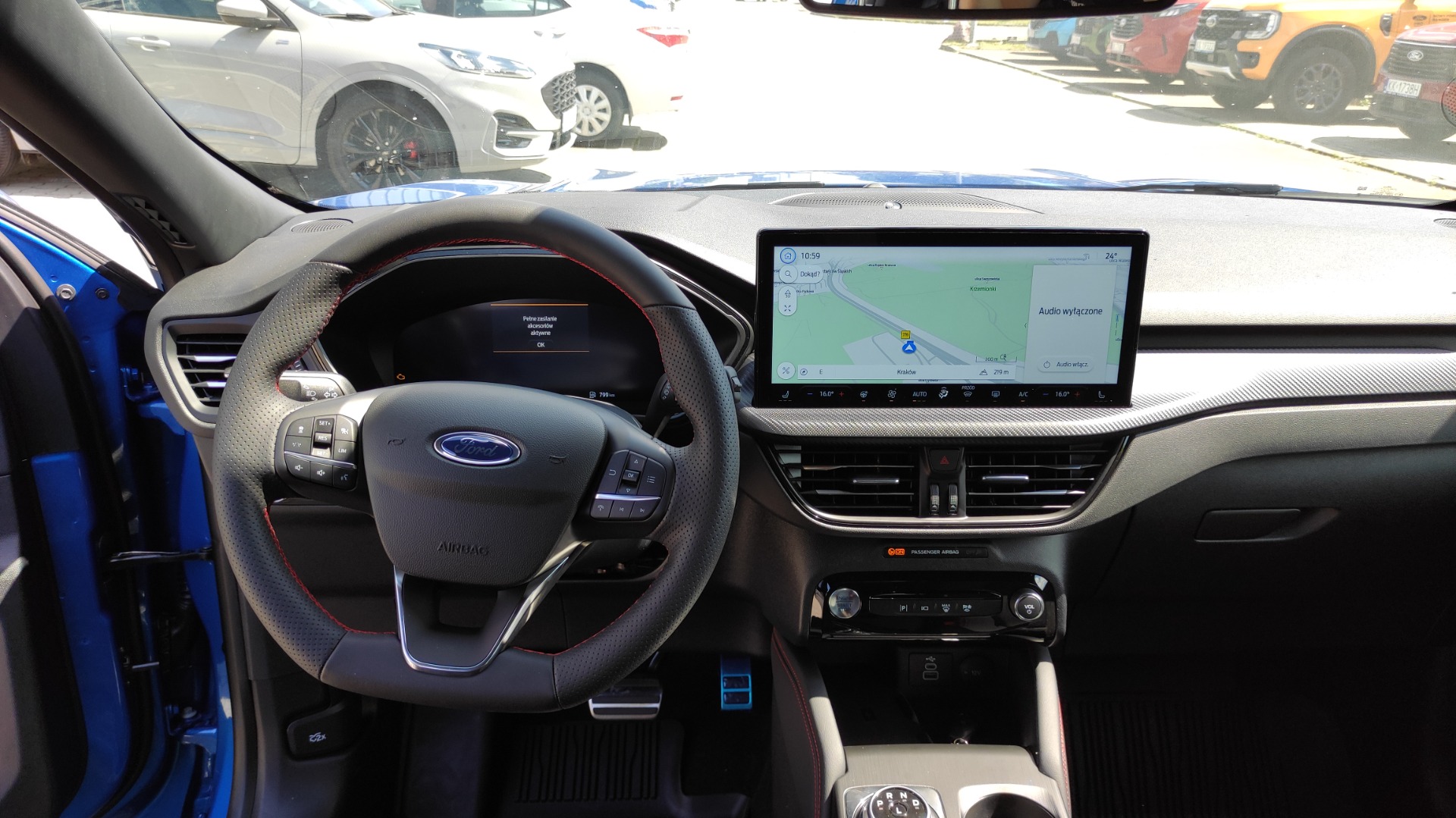 *Radioodtwarzacz z SYNC 4, DAB+, nawigacją satelitarną i systemem audio premium B&O – kolorowy wyświetlacz dotykowy 13.2", bezprzewodowa obsługa Apple CarPlay i Android Auto (wymaga kompatybilnego telefonu), zestaw głośnomówiący z Bluetooth®, obsługa głosowa w języku polskim, system nagłośnienia B&O (9 głośników + subwoofer), gniazdo USB, zdalne sterowanie na kierownicy
