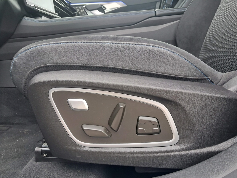 * Tapicerka materiałowa łączona z elementami z Alcantary i skóry ekologicznej z niebieskimi przeszyciami