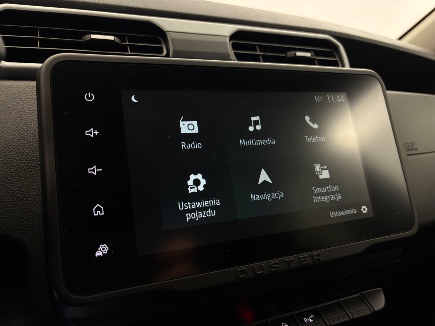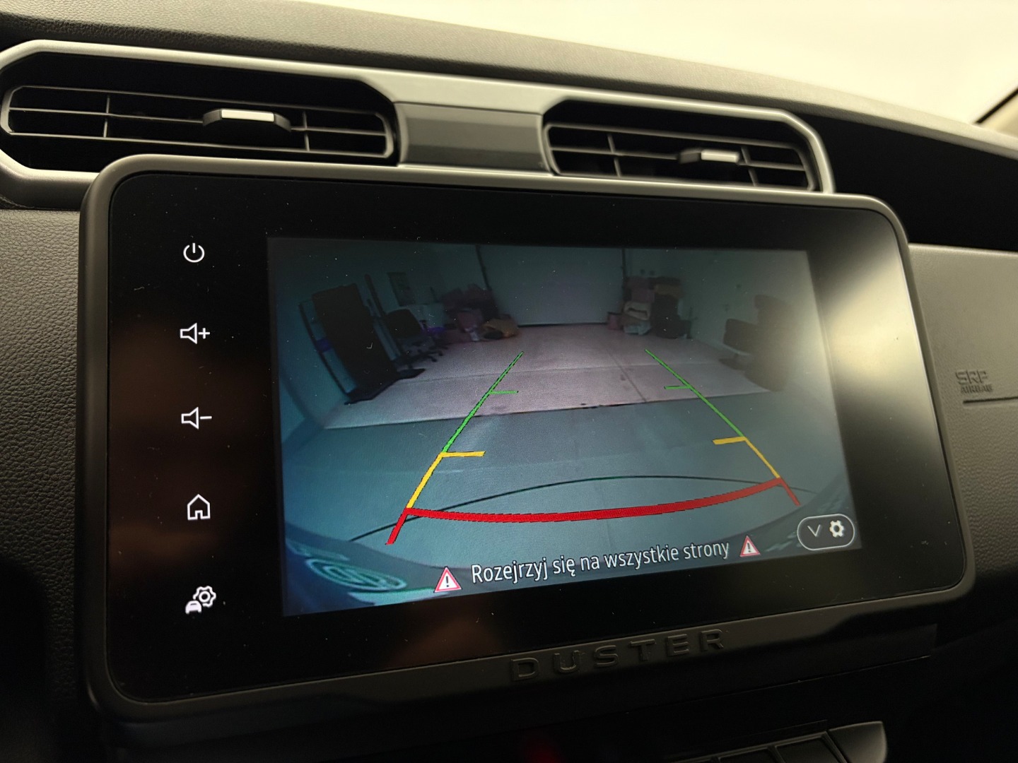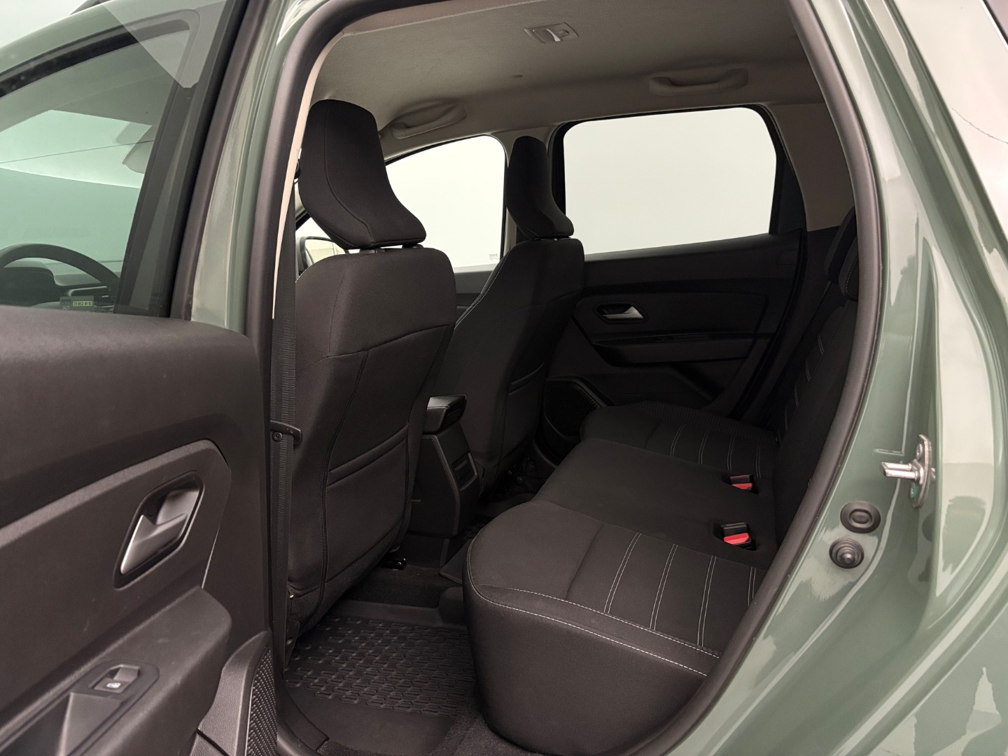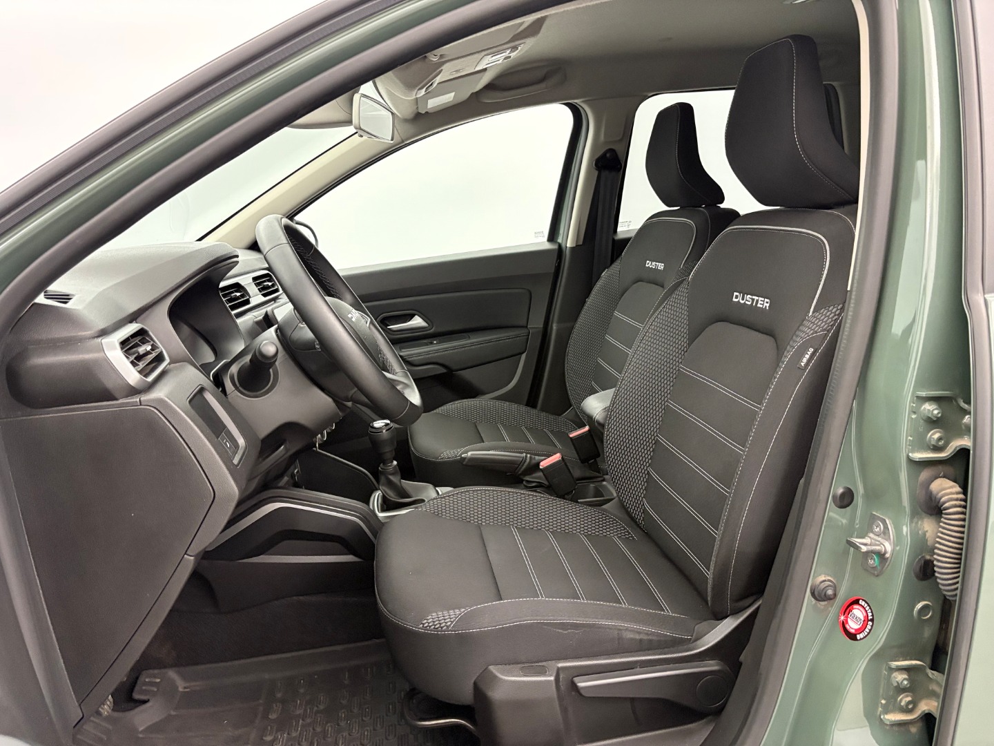 * Tapicerka materiałowa w kolorze czarnym z białymi przeszyciami i logiem Duster